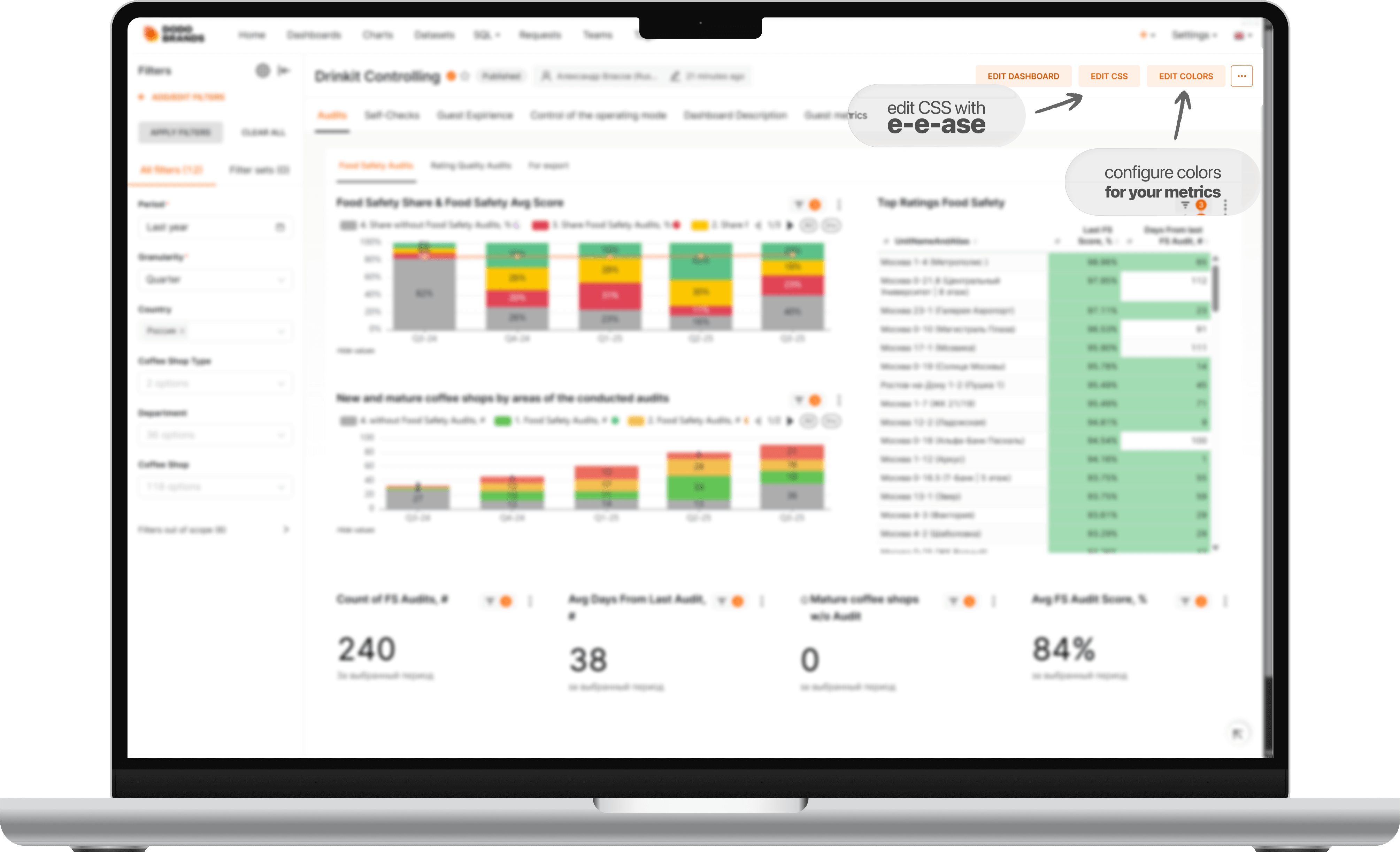 Transform the look and feel of your dashboards in seconds. Adjust CSS and colors directly from the editor to match your brand and highlight what matters most.